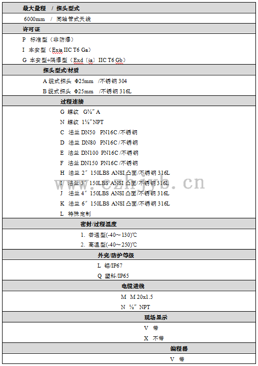 本產品的防爆形式為本質安全型。防爆標志:Exia IIC T6。本安型導波雷達物位計采用壓鑄鋁外殼材料,電子部件采用膠封 結構,從而確保電路部分故障時產生的火花不會泄放出來。本產品適用于Exia IIC T6 防爆等級以下可燃性介質的物位連續測量。